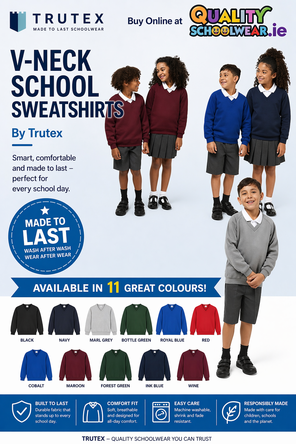 The Royal Blue School Sweatshirt (v-neck) by Trutex is a dependable, stylish, and practical addition to any student’s daily uniform. Thoughtfully designed to meet the demands of busy school life, this unisex jumper combines a smart appearance with long-lasting comfort, making it an ideal choice for both classroom learning and outdoor activities. Its classic V-neck design allows it to be easily layered over shirts and polo tops. This helps students maintain a neat, polished, and professional look throughout the school day.